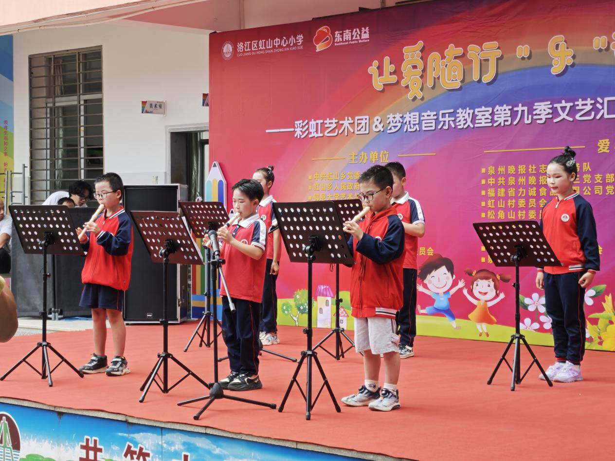 随着音乐响起,精彩的表演正式拉开帷幕。williamhill中文官网支教员工带来的舞蹈《小城夏天》活力四射,用灵动的舞姿展现青春的朝气;古筝表演中,悠扬的琴声缓缓流淌,带领观众沉浸在古典艺术的美妙意境中。在支教老师的悉心指导下,虹山中心小学彩虹艺术团的小朋友们也纷纷登台,带来葫芦丝、顺笛、竖笛、陶笛表演。孩子们稚嫩却认真的演奏,让现场掌声不断,每一个音符都饱含着他们对艺术的热爱。演出最后,艺教的支教员工们合唱歌曲《稻香》,温暖的歌声传递着希望与力量,为这场充满爱的汇演画上圆满句号。